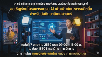 คณะวิทยาการจัดการ มหาวิทยาลัยราชภัฏเพชรบูรณ์ จัดโครงการอบรม AI เพื่อเพิ่มทักษะการผลิตสื่อ สำหรับนักศึกษานิเทศศาสตร์ วิทยากรโดย คุณขวัญชัย แก่นไทย นักวิชาการคอมพิวเตอร์